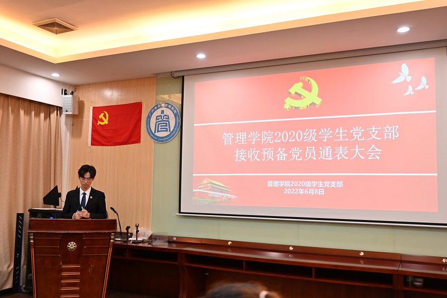 为了做好发展党员的工作,不断壮大党员队伍,保持党员队伍生机活力。管理学院2020级学生党支部于6月8日晚上在二政208召开接收预备党员通表大会。出席本次大会的有管理学院党总支书记汪椿东、2020级学生党支部书记袁小蕾、组织委员林冬梅及支部全体党员。本次会议由黄灿伟主持。