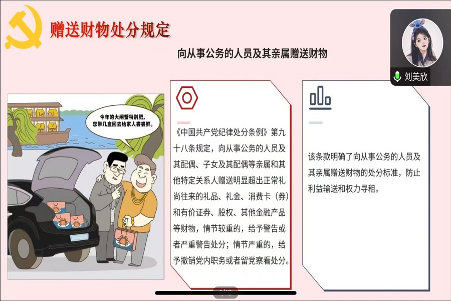 刘美欣对本次党课作出总结,结合实际向全体党员提出三点希望:一是坚守纪律底线,将规矩挺在前面,以廉洁为基本修养筑牢思想防线;二是深化纪律意识,把纪律要求内化为自觉认知,外化为行动准则,做到知行合一;三是树立标杆意识,以更高标准严格要求自己,带动支部建设向提质增效目标迈进。
