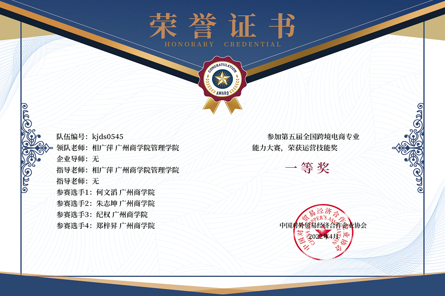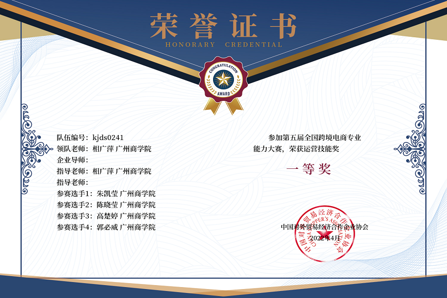 本次大赛内容覆盖跨境电商整体业务,包含知识、技能、策划三个模块。技能竞赛版块内容主要分为:测试参赛队跨境电商B2B公共平台、跨境电商海外仓集货和单一窗口跨境电商模块操作能力,主要评估参赛队跨境电商基本业务能力。策划竞赛版块内容主要分为:测试参赛队跨境电商独立站建设和跨境电商大数据分析,主要评估参赛队跨境电商业务策划的基础能力。 本次大赛分为全国赛、区域赛。区域赛与全国赛的知识、技能、策划模块为同一赛事,使用相同赛题、在相同时间参赛。区域赛与全国赛一次评分、两次计奖。比赛面向全国大学生举办,先经由各个区域赛点的初次选拔,最终有491支参赛队伍参与第二阶段比赛。我院参赛学生来自电子商务、市场营销、物流管理、酒店管理等专业。其中,由朱凯莹、陈晓莹、高楚婷、郭必威和何文滔、朱志坤、纪权、郑梓昇组成的两支队伍斩获大赛决赛一等奖,由侯秀伶、张文君、谢舒琪、黄俊燕组成的队伍斩获大赛决赛二等奖。