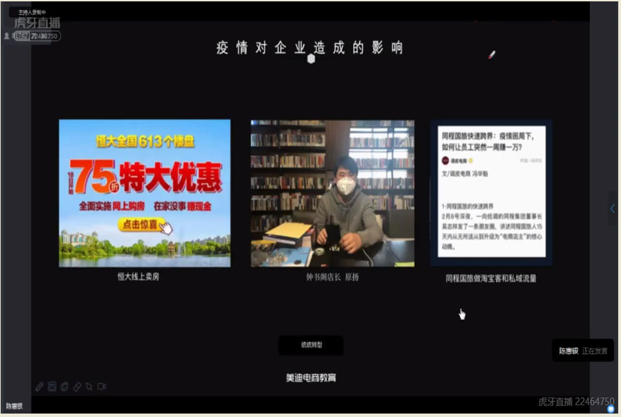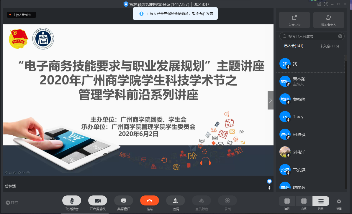 为了让同学们进一步了解电子商务行业发展现状和趋势,树立同学们对电子商务未来职业发展规划的正确认识,同时提高同学们的专业知识技能,管理学院于2020年6月2日晚上19:00在线上平台举行了广州商学院2020年学生科技学术节管理学科前沿系列之“电子商务技能要求与职业发展规划”主题讲座,这也是管理学院“商海论道”论坛系列讲座第十三场。本次讲座由广州美迪教育科技有限公司新媒体总监陈惠银主讲,出席本次讲座的嘉宾有2016级辅导员徐佳佳,2017级辅导员杨红烨,管理学院电子商务专业全体学生参加。本次讲座由方贤珊主持。