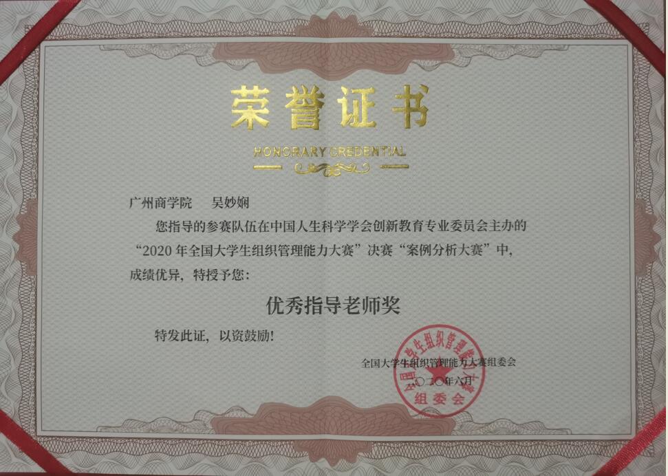 该大赛坚持贯彻落实教育部“全面提高人才培养质量”的相关文件精神,主办单位中国人生科学学会创新教育专业委员会是中国人生科学学会的直属机构,是由教育部主管,民政部注册的国家一级社团。本次大赛分为两个阶段,4月至6月为初赛阶段,开展线上组织管理知识竞赛。7月进入决赛阶段,进行企业案例分析大赛。共有来自香港城市大学、澳门大学、中山大学、复旦大学、上海交通大学、南京大学、重庆大学、武汉大学等多所高校2376支队伍参加决赛。在决赛阶段,在吴妙娴老师的悉心指导下,“精英战队”刻苦钻研,结合赛题要求和组织管理相关理论,以“珠海格力电器股份有限公司”为研究对象,通过调研收集相关数据资料,分析格力在疫情早中后期,在战略决策、业务模式、规则制度、员工管理等方面的调整及影响,并提出进一步建设性建议,形成完整的案例分析报告。案例分析结构完整、逻辑清晰、有理有据、理论运用得当、结论及建议有一定的可行性,获得评委老师的认可,在众多高校作品中脱颖而出,最终获得一等奖。