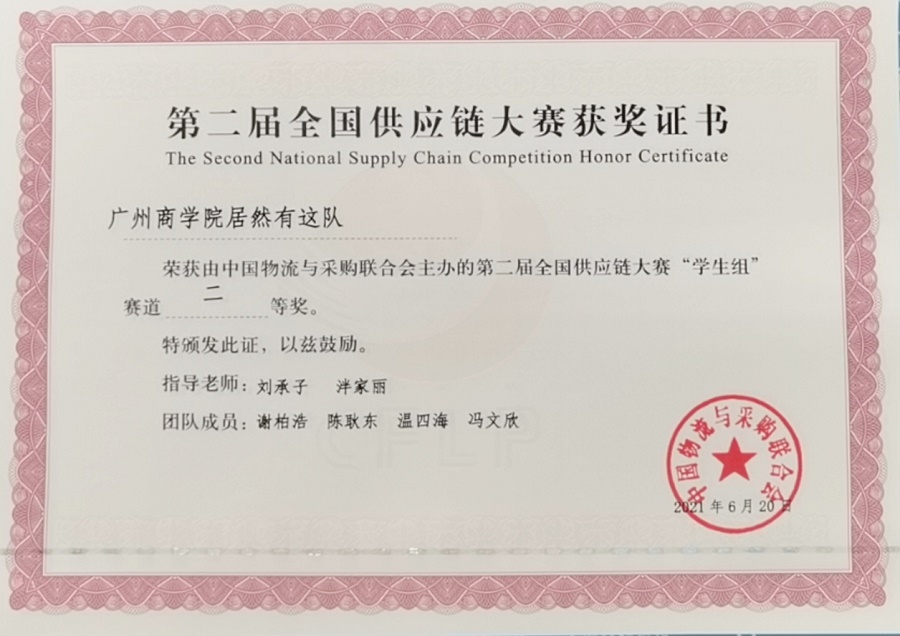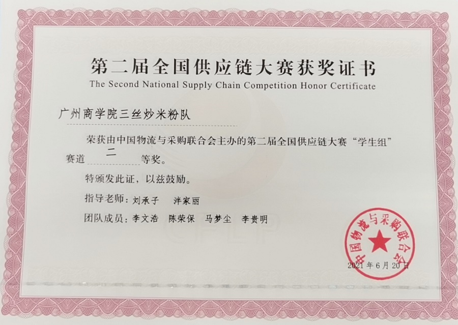 本次大赛共设置了四个阶段赛程,分别是校园选拔赛、全国初赛、复赛和全国总决赛,竞赛内容主要是以供应链运营管理、供应链规划设计、供应链案例分析为核心,通过供应链运营实战、供应链规划实战、供应链案例分析等竞赛方式,培养参赛人员严谨周密的思维方式、系统的思维能力和运营的全局观,提升团队合作和沟通协调等能力。校园选拔赛是由广州商学院物流协会承办,经两周的校赛选拔后,三丝炒米粉队和居然有这队两支队伍脱颖而出代表我校参赛;在接下来的初赛、复赛中,两支队伍经过激烈拼杀,在来自全国29个省、市、自治区的537所院校、619支本科队伍中脱颖而出,分别以全国第五名、第四十七名进入全国总决赛;最后根据总决赛要求,依据组委会提供的案例数据,提交了总体设计方案,并双双斩获全国总决赛的本科组二等奖。