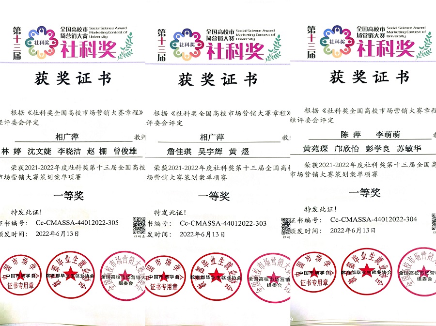 6月,第十三届全国高校市场营销大赛落下帷幕。由我院相广萍、陈萍、李萌萌老师指导的管院学子四月天队、三剑客队、名企实习队荣获第十二届全国高校市场营销大赛策划单项赛大赛决赛一等奖,没在线队、 四人大队荣获策划单项赛大赛决赛二等奖。