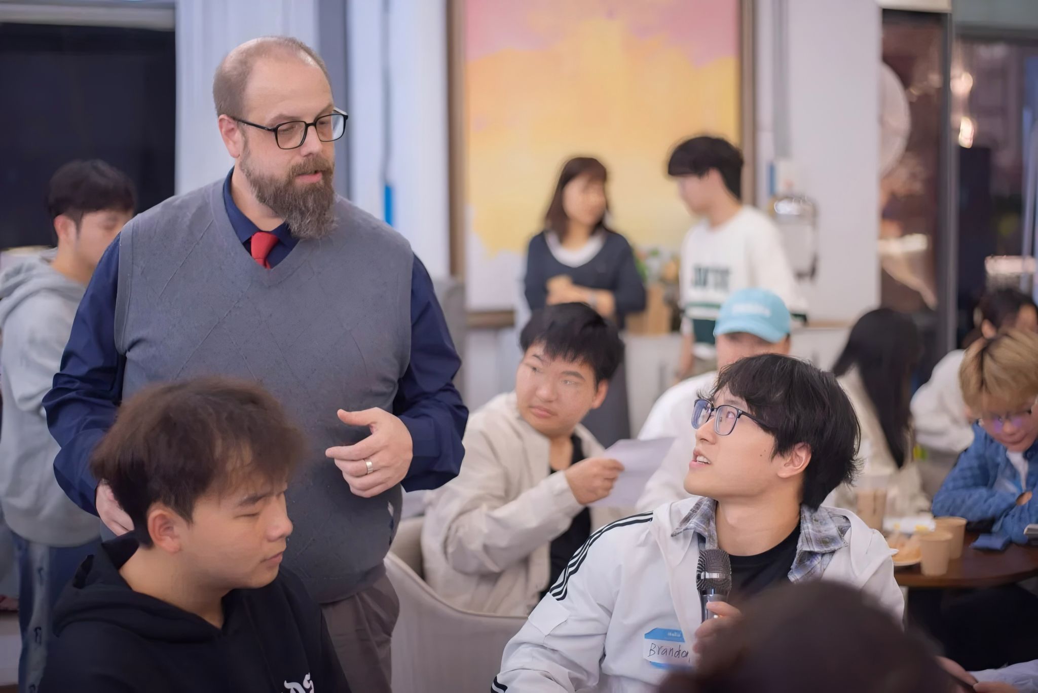 外教Kay则向同学们发放了一张纸片与20枚“特殊货币”,纸片上写有各种理想伴侣的品质,如“善良”“智慧”“幽默”“富裕”等,它们各有价格,同学们需要用特殊货币去购买,由此引发激烈辩论。随后,屏幕上轮番出现运动型女孩、肌肉男、哥特风女孩、光头大胡子大叔等多元形象,Kay笑问“谁是你的理想型”,现场笑声不断。最后,他以“如果暗恋(crush)你会怎么做?”“该让对方知道你的心意吗?”“单身最大的好处是什么?”等灵魂拷问收尾,推动大家深入思考亲密关系的多样形态。
