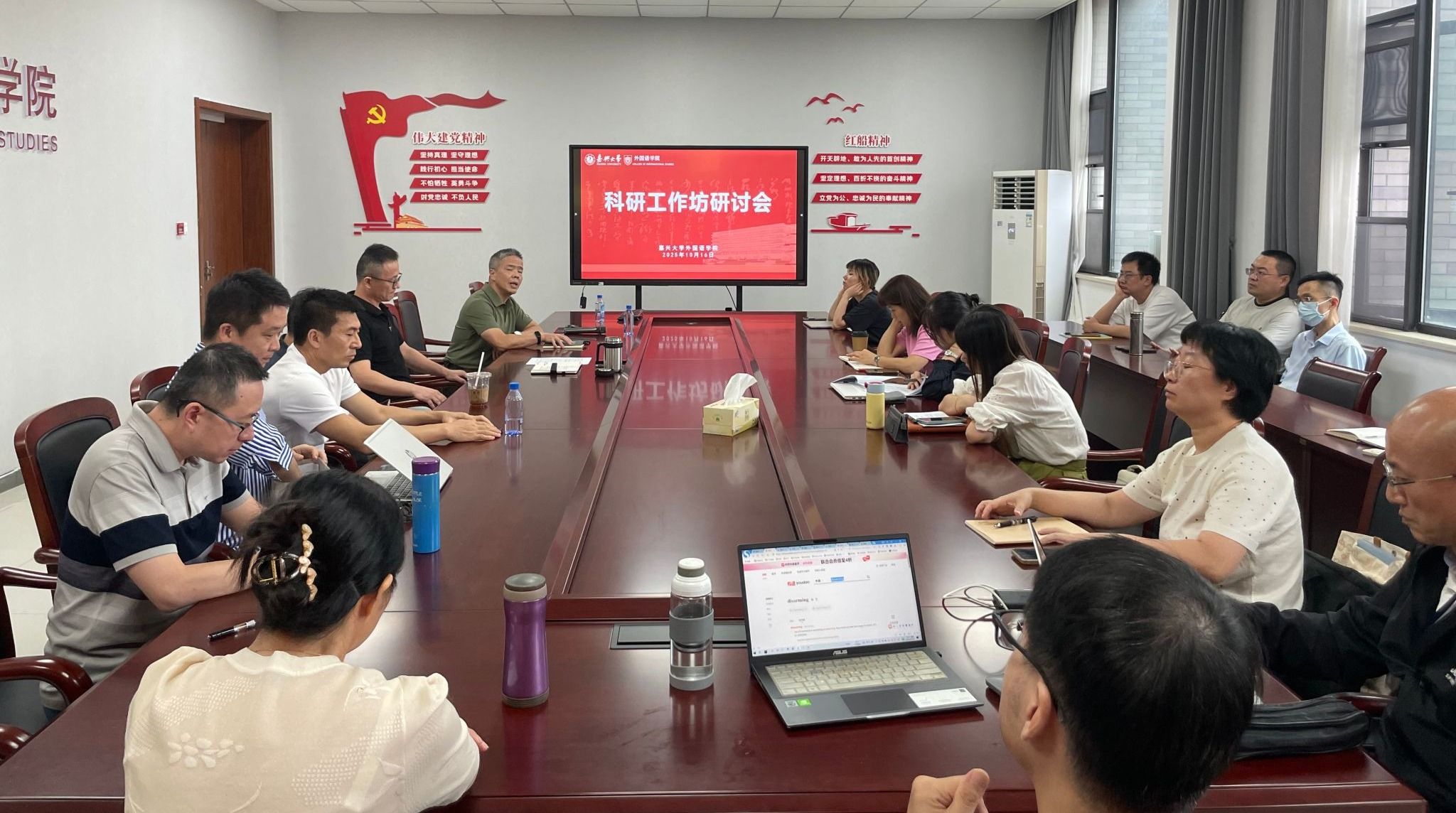 院长唐艳芳在致辞中充分肯定科研工作坊的创新举措,同时指出:要构建“传帮带”科研梯队,强化老中青教师协同攻关能力,要深化学科交叉融合,主动对接人工智能、区域国别等前沿领域。他特别强调,工作坊是推动教师科学研究的重要平台,鼓励大家充分利用该平台产出高水平论文、获立高层次项目,全面提升学科核心竞争力。