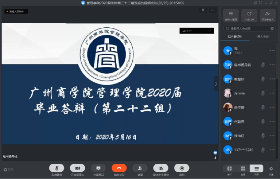 2020届毕业生答辩处于在疫情防控的特殊时期,线上答辩作为毕业生的最后一课,学院努力做到形式有温度、工作有质量、学生有收获。管理学院全体教职工助力线上答辩,稳步部署各项工作,通力合作,使得各项工作有条不紊,顺利结束。