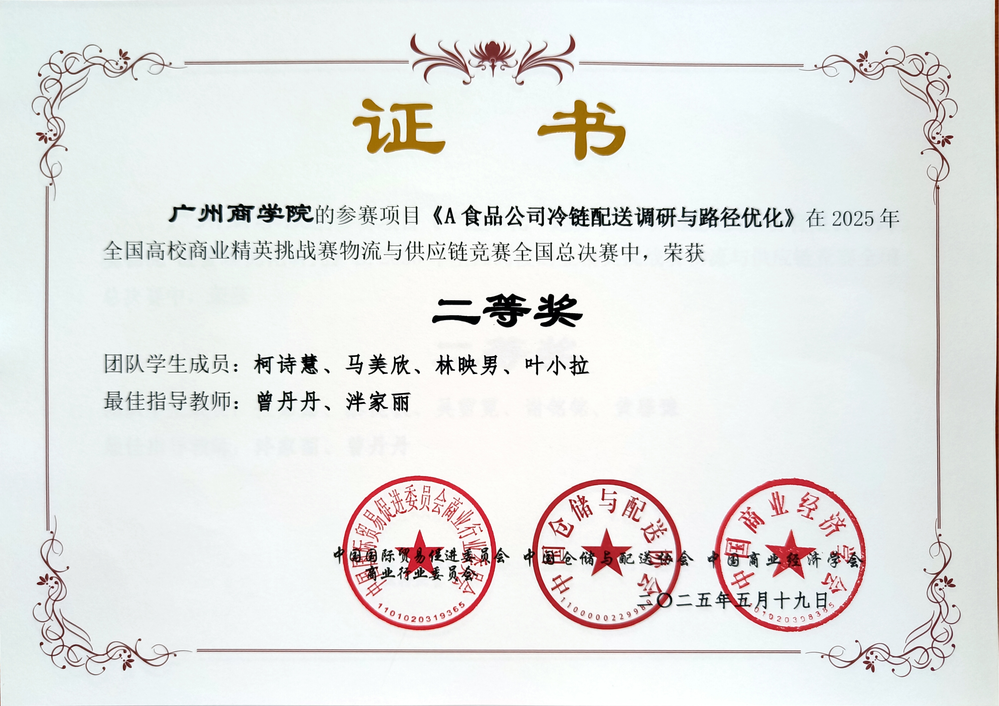 近日,由中国国际贸易促进委员会商业行业委员会、中国仓储与配送协会、中国商业经济学会主办的2025年全国高校商业精英挑战赛物流与供应链竞赛全国总决赛圆满落幕。本次大赛我院有3支队伍代表队参加,与济南大学、上海财经大学、西南石油大学等近200所院校、近600支队伍展开激烈角逐,最终斩获佳绩,分别荣获国家级一等奖1项、国家级二等奖2项。