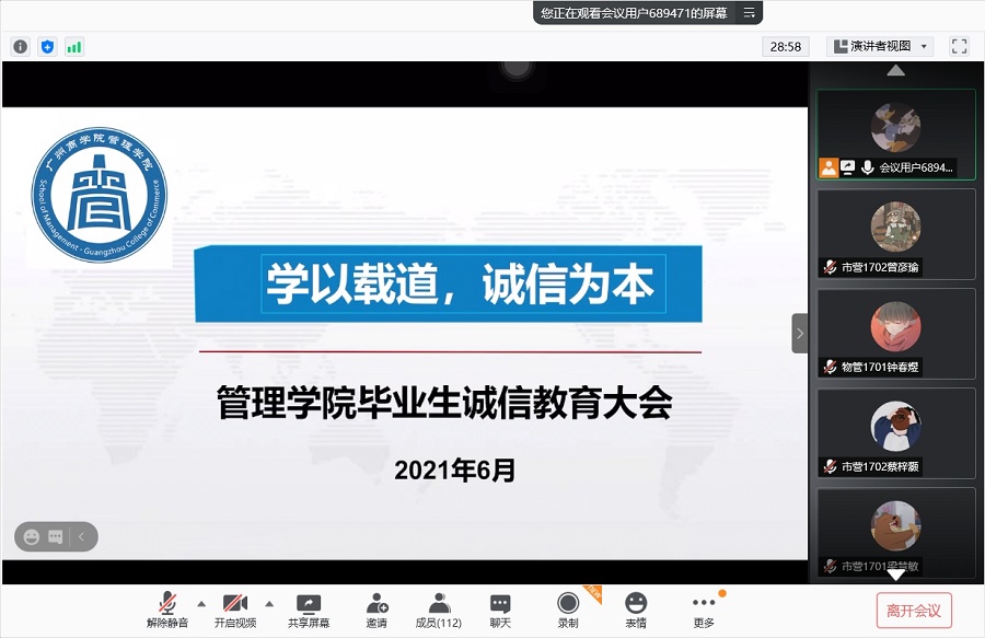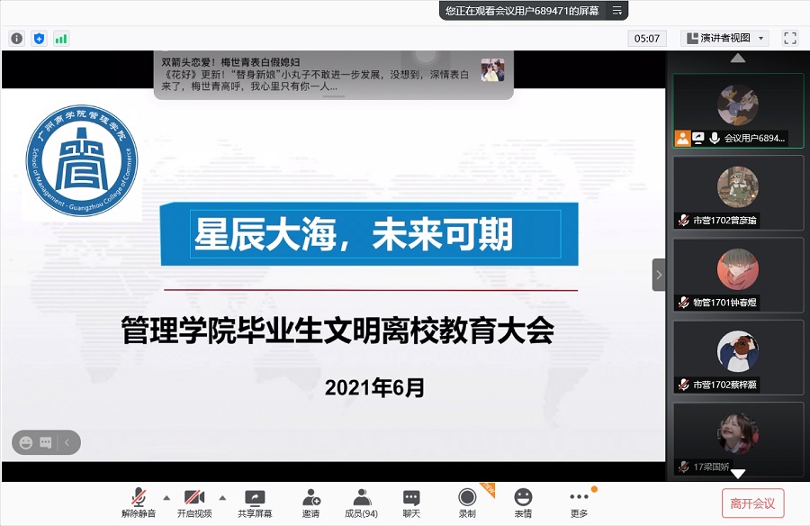 为切实做好毕业生文明离校教育,进一步引导毕业生铭记党恩、情系母校,深植爱校荣校情怀,营造健康、文明、和谐、有序、暖心的毕业离校氛围。6月23日晚上,管理学院2017级通过腾讯会议开展了“星辰大海,未来可期——管理学院2017级毕业生文明离校暨诚信教育”。会议由2017级辅导员杨红烨、肖娴主讲。