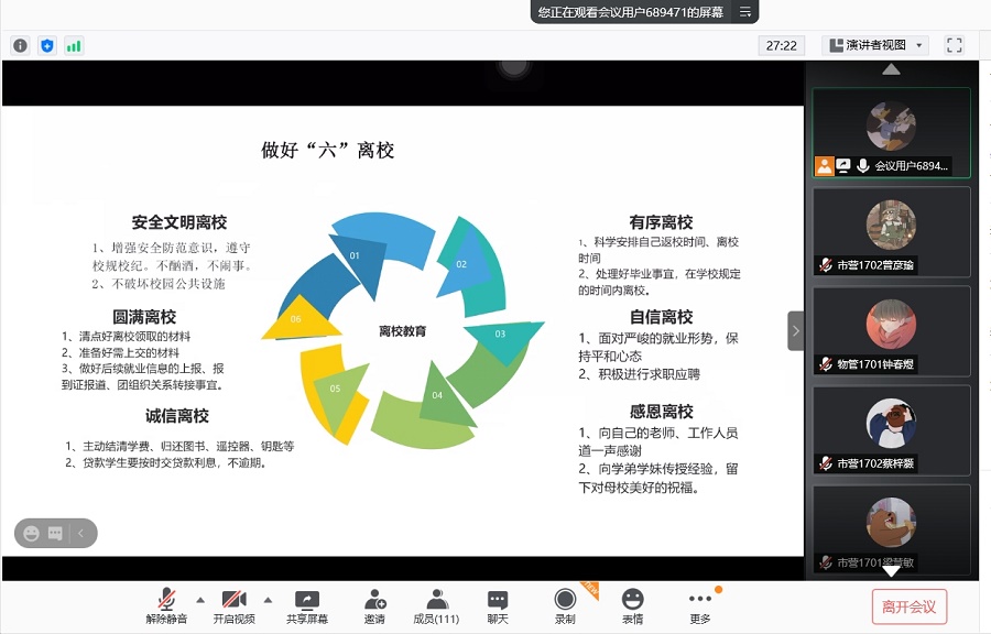 杨红烨、肖娴传达了学校的返校离校指引。重点介绍了返校离校流程、疫情防控要求、返校当天安排、学生需领取物品清单、离校后续物品等相关安排。并呼吁同学们严格遵守校规校纪,安全文明离校。对于未就业同学再次进行了就业动员,希望同学们能够树立正确的就业观念。已经找到工作岗位的同学要保持不骄不躁的心态,虚心求教,努力工作。未就业的同学可以改变自己的就业观念,先就业再择业,积极行动。同时进行了毕业生的诚信教育,向所有助学贷款的同学解读了相关贷款还款政策以及征信等法律知识。对于接受过国家助学金的同学进行了感恩教育,希望他们可以牢记国家、党和学校对于他们的支持与鼓励。