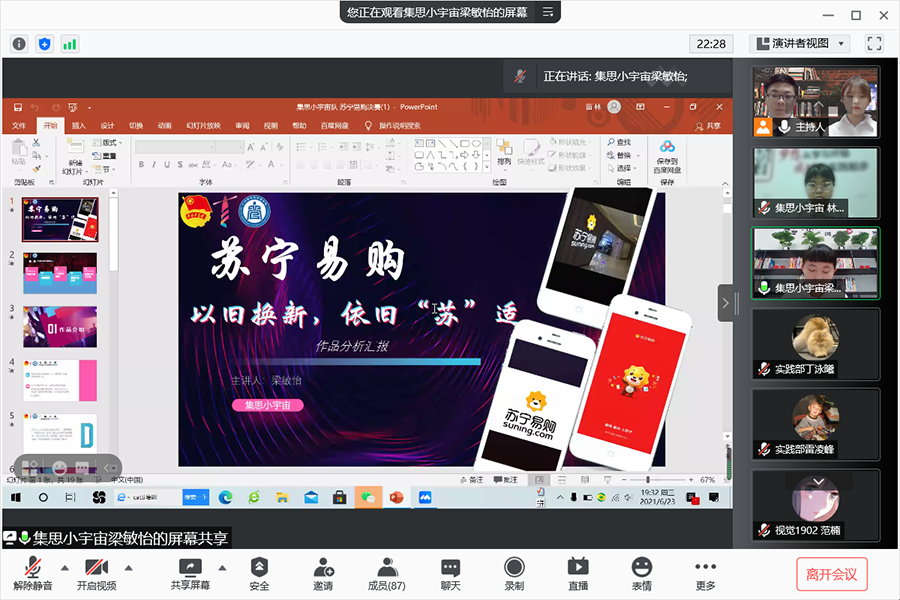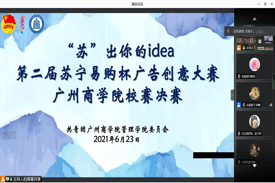 为培养广商学子勇于探索的创新精神和创新实践能力,将专业学科知识与实践充分结合,共青团广州商学院管理学院委员会于6月23日晚在腾讯会议举办2021年科技学术节之“‘苏’出你的idea”第二届苏宁易购杯广东省大学生广告创意大赛广州商学院校赛决赛。出席本次活动的评委有广州商学院管理学院党总支书记汪椿东,苏宁易购人力资源中心培训负责人经理马夏红,管理学院实验实训中心主任陆川,管理学院团委书记李俞妍,学生会指导老师蔡俊发,市场营销教研室专任老师杨晨。