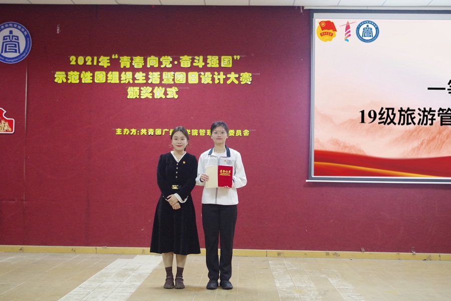 本次主题团日设计大赛覆盖全院在校44个团支部,2000多名学生,评选出10个优秀集体,2019级旅游管理二团支部荣获一等奖,2019级物流管理一团支部荣获二等奖,2020级电子商务二团支部荣获三等奖,2019级市场营销二团支部、2020级物流管理二团支部、2020级市场营销二团支部、2019级酒店管理一团支部、2019级电子商务三团支部、2021级电子商务一团支部荣获优秀奖,李俞妍、蔡俊发、林冬梅、袁小蕾为获奖的团支部进行颁奖。