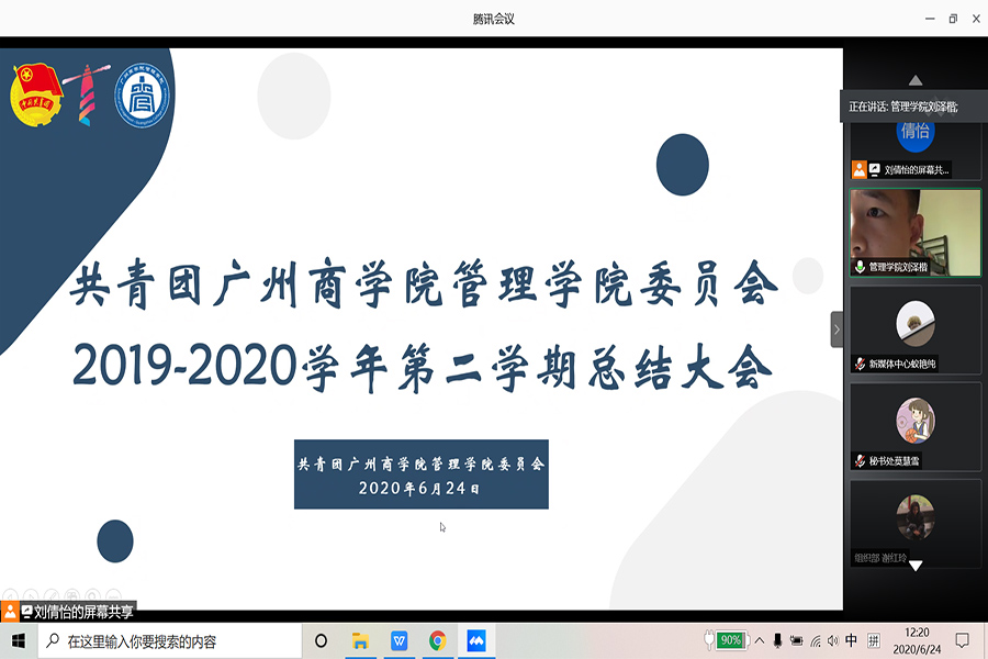 为总结本学年团委的各项工作,提高工作质量,更好地服务广大同学,共青团广州商学院管理学院委员会于2020年6月24日中午在腾讯会议召开了2019-2020学年第二学期总结大会。管理学院团委书记李俞妍及团委全体成员参加了本次会议。