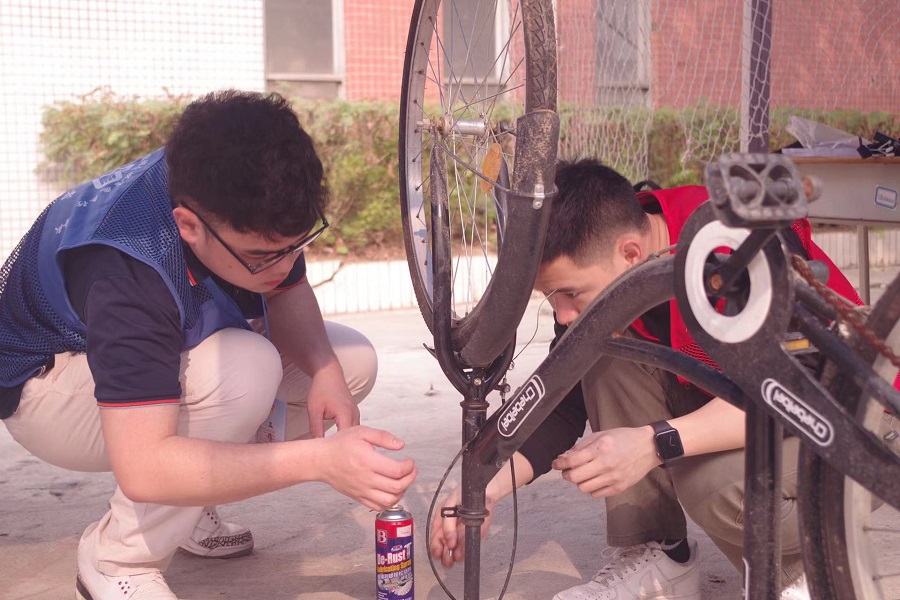 为深入学习贯彻习近平总书记关于学雷锋志愿服务工作的重要指示精神,紧紧围绕培育和践行社会主义核心价值观,大力传承弘扬雷锋精神,引导广大青年学生将全心全意为人民服务的奉献精神、尽职尽责的“钉钉子”精神融入实践中,在全国第60个“学雷锋纪念日”到来之际,管理学院于3月5日在第二行政楼对面组织开展“五彩青春学雷锋,校园义修‘骑’奉献”自行车公益维修志愿服务活动。