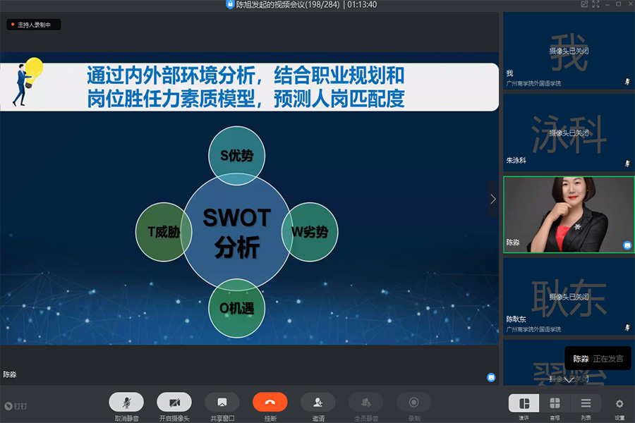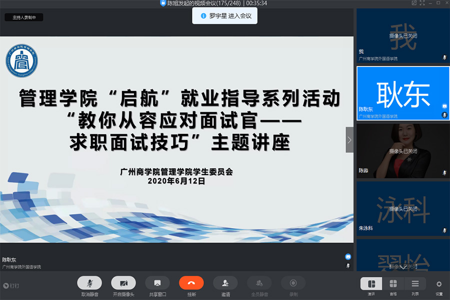 为了进一步提升大学生的求职面试技巧,加强面试应变能力,实现面试就业理论知识与实践的深度结合,帮助学生更好地实现就业。管理学院于2020年6月12日晚19:00在线上平台举行了 “启航”就业指导系列活动之“教你从容应对面试官——求职面试技巧”主题讲座,本次讲座由中国百强讲师、广州欢创集团企业大学校长陈淼老师主讲,出席讲座的嘉宾有管理学院团委书记李俞妍,学生会指导老师蔡俊发,17级辅导员黄启明、杨红烨。