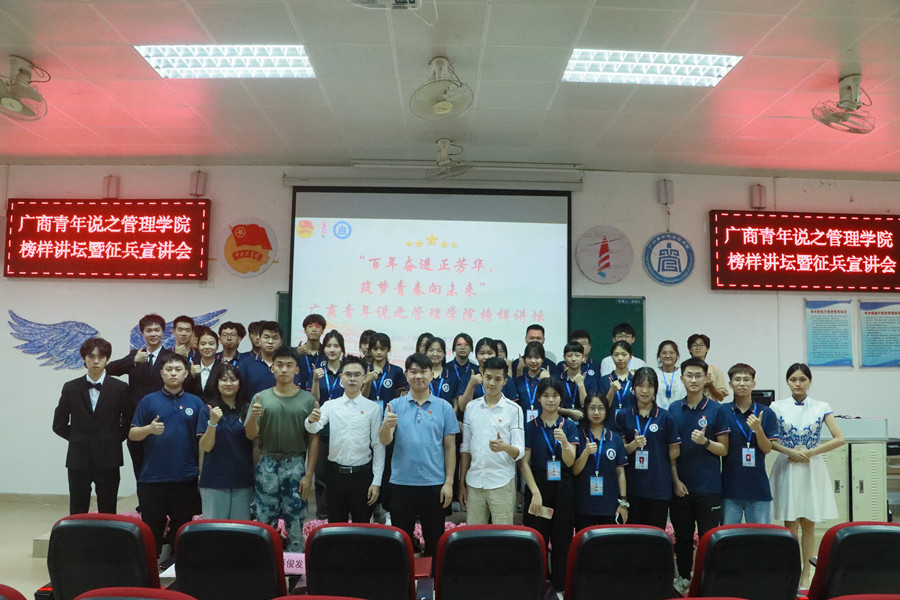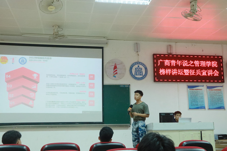 为帮助同学们拓宽就业思路,明确就业方向与目标,同时做好大学生征兵入伍宣传工作,鼓励大学生积极应征入伍。6月19日晚上19:00,管理学院在第四教学楼第二报告厅开展了“百年奋进正芳华,筑梦青春向未来”广商青年说之管理学院榜样讲坛暨征兵宣讲会。出席本次活动的嘉宾有学生会指导老师蔡俊发、2019级专升本辅导员黄华科以及各二级学院学生工作人员代表。