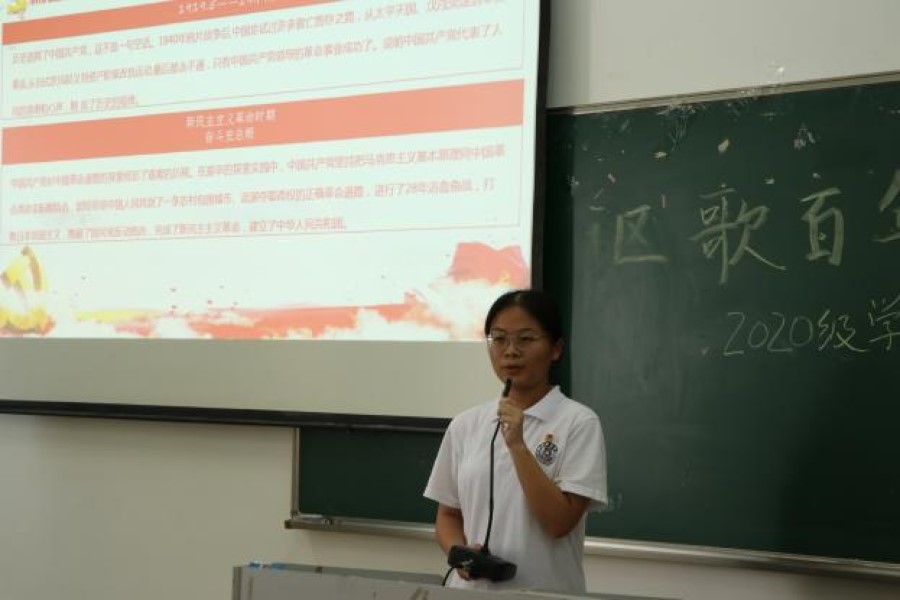 活动的第一个环节,由柯陈洁带领同学们学习《求是》杂志发表的习近平总书记重要文章 《以史为镜、以史明志,知史爱党、知史爱国》。文章强调,历史是最好的教科书,只有坚持和发展中国特色社会主义才能实现中华民族伟大复兴,柯陈洁通过分享在武汉疫情和广州疫情中的典型事例,鼓励各位积极分子不忘初心、牢记使命、锤炼党性、坚定信仰、勇敢斗争,为新时代全面建设社会主义现代化国家而不懈奋斗。随后,由黄灿伟同学主持微党课初赛。27组选手依次上台通过PPT展示进行微党课演讲。参赛选手紧扣“开天辟地”“改天换地”“翻天覆地”“惊天动地” 四个主题,以党的重大事件为线索,以不同时期的典型事例、历史人物、精彩故事为主干,回顾党的伟大历程和辉煌成就,用生动的语言、鲜活的图片、丰富的视频带领大家回望历史长河。