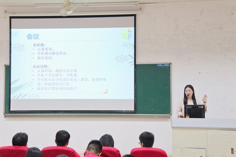 本次培训由刘智莹主讲。她主要从团学介绍、礼仪培训、文书培训三大板块对干部们进行培训。她强调,良好的文明礼仪是大学生最基本的素养,无论是否身为学生干部,都需要学会为人处世,提高自己的文明修养。她日常工作中的活动会议礼仪,收发文件信息礼仪,打电话礼仪等方面对 干部提出了要求。在文书方面,她对会议记录,工作计划和总结,活动策划书等进行培训,提出干部应掌握基本的文书技巧,注意格式和规范。会议记录应当完整真实;计划文案应清晰周详,有预案措施;总结要有自己对问题的改进方法的思考等。