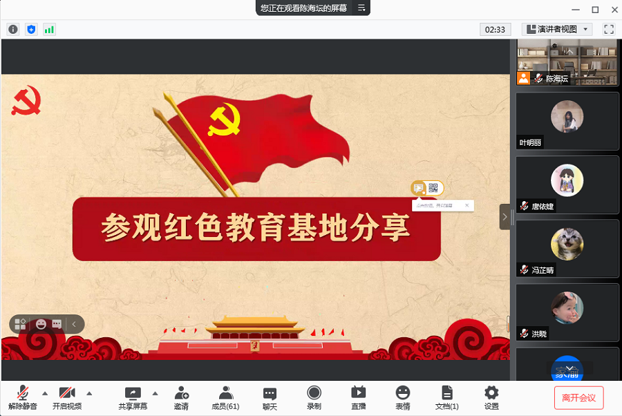 为引导师生党员重走红色革命基地,传承红色基因,推动党史学习教育不断走深走实。管理学院18级学生党支部于2021年8月25日晚8:00,在腾讯会议召开红色教育基地分享会。出席本次会议的有管理学院2018级学生党支部书记李文娣、宣传委员刘智莹、全体学生党员及预备党员。本次会议由组织委员陈海坛主持。