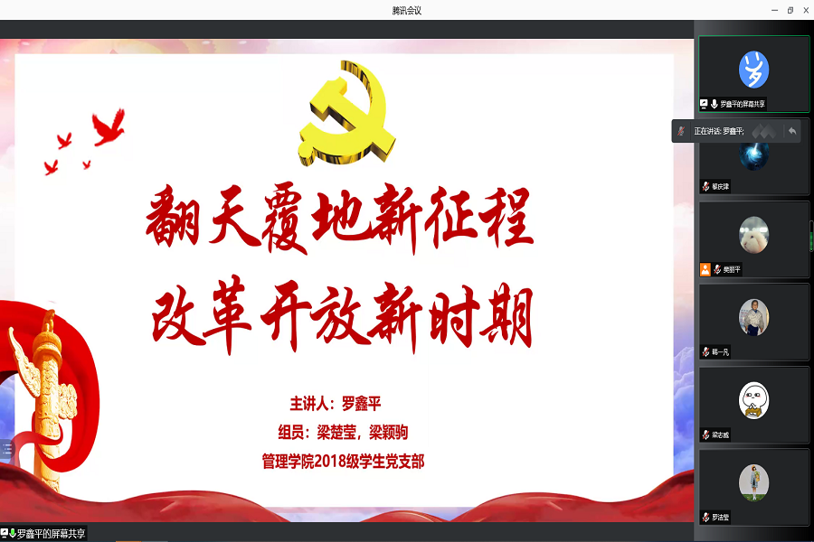 为持续深入推进党史学习教育,响应省党史学习教育巡回指导组的号召,管理学院18级学生党支部于7月21日晚召开“翻天覆地新征程,改革开放新时期”党史学习教育专题大会。出席本次大会的有:党支部书记李文娣、宣传委员刘智莹、组织委员陈海坛以及支部全体党员。