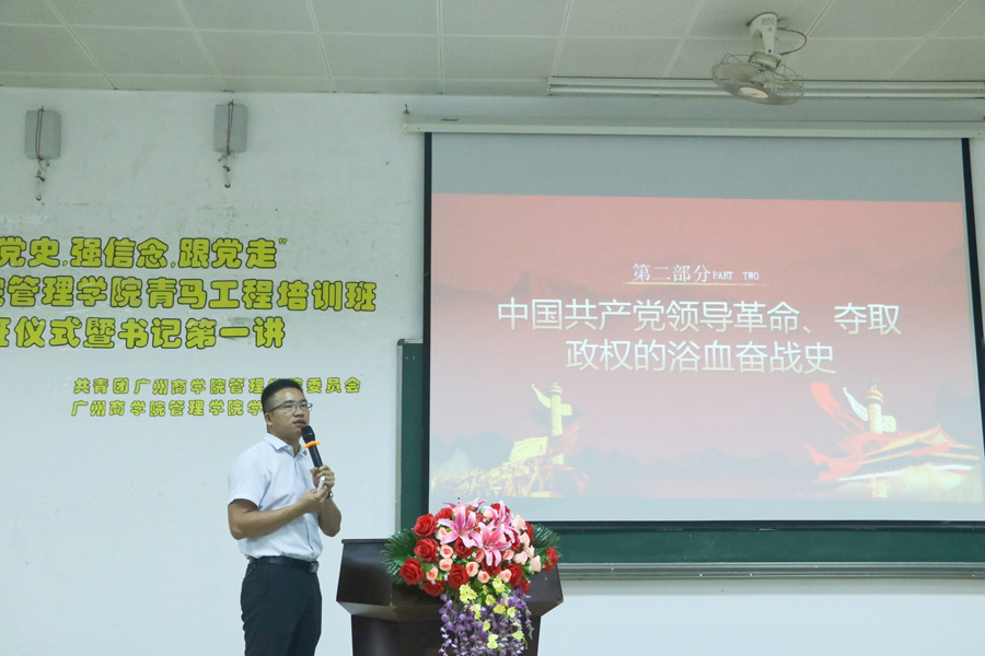为深入学习贯彻习近平新时代中国特色社会主义思想和党的十九大精神,认真贯彻落实习近平总书记关于青年工作的重要思想,着力为党培养和输送坚定的青年政治骨干,管理学院在建党一百周年之际,以“学党史,强信念,跟党走”为主题开展学院2021年“青年马克思主义者培养工程”(以下简称“青马工程”)集中培养工作,并于5月24日中午在四教第二报告厅举行开班仪式。管理学院党总支书记汪椿东,团委书记李俞妍,学生会指导老师蔡俊发,17级辅导员杨红烨,18级辅导员李文娣、刘智莹,20级辅导员张亚珍、柯陈洁和本期青马工程全体学员出席开班仪式,仪式由学员代表彭璇主持。