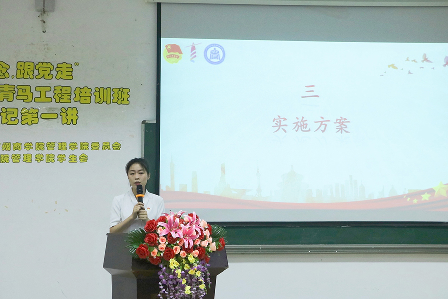 会上,学院团委书记李俞妍从选拔程序、课程构架和管理制度三方面对《广州商学院管理学院“青马工程”实施方案》进行重点解读,并对学员们寄于殷切厚望。全体学员高举右拳,在杨应涛同志的带领下庄严宣誓,声音铿锵,催人奋进。
