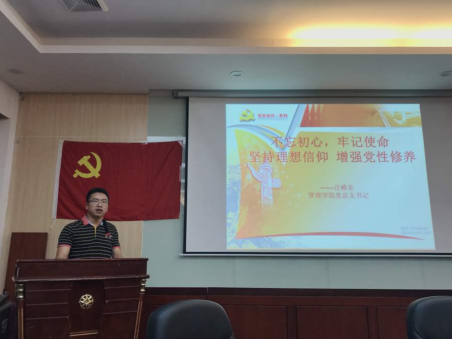 汪椿东宣布管理学院分党校第一期积极分子党课正式开班。他以“不忘初心、牢记使命,坚持理想信仰,增强党性修养”的主题展开授课,从信仰之涵义,中国共产党人的信仰,党性的概念,加强党性修养等方面进行讲述,提到女排精神,屠呦呦在科学研究上无私奉献,70周年国庆阅兵仪式等中国人民坚定的理想信念,号召入党积极分子要有坚定的理想信念,树立远大理想,不断提高自己理论修养,政治修养,思想道德修养,能力修养,纪律修养和作风修养。