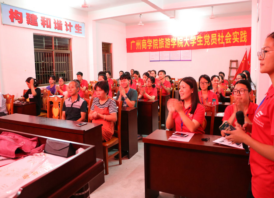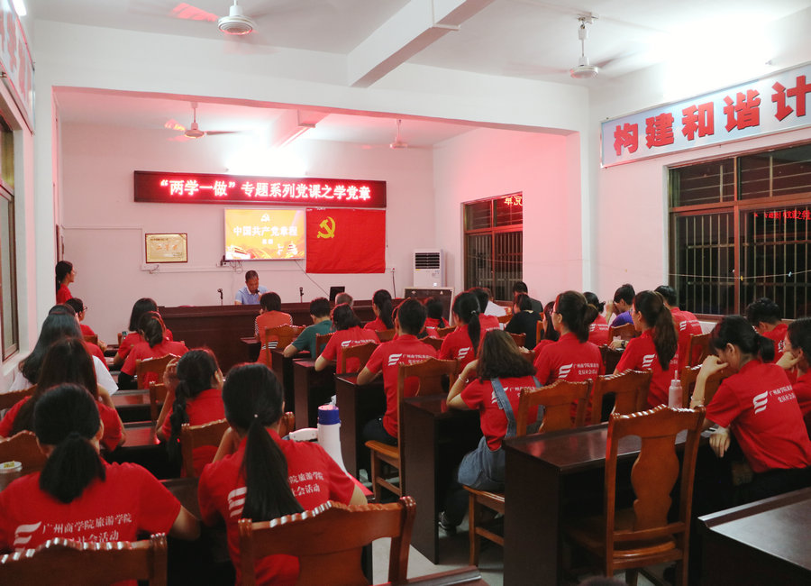 为深入贯彻“两学一做”,提高大学生党员的党性修养,7月16日晚上8点,广州商学院旅游学院大学生社会实践服务队召开了以“中国共产党章程--总纲”为主题的党课,出席党课的有东华村村支部书记吴剑亮以及东华村老党员们、服务队指导老师蔡俊发、刘智莹、梁智斌和全体学生党员。