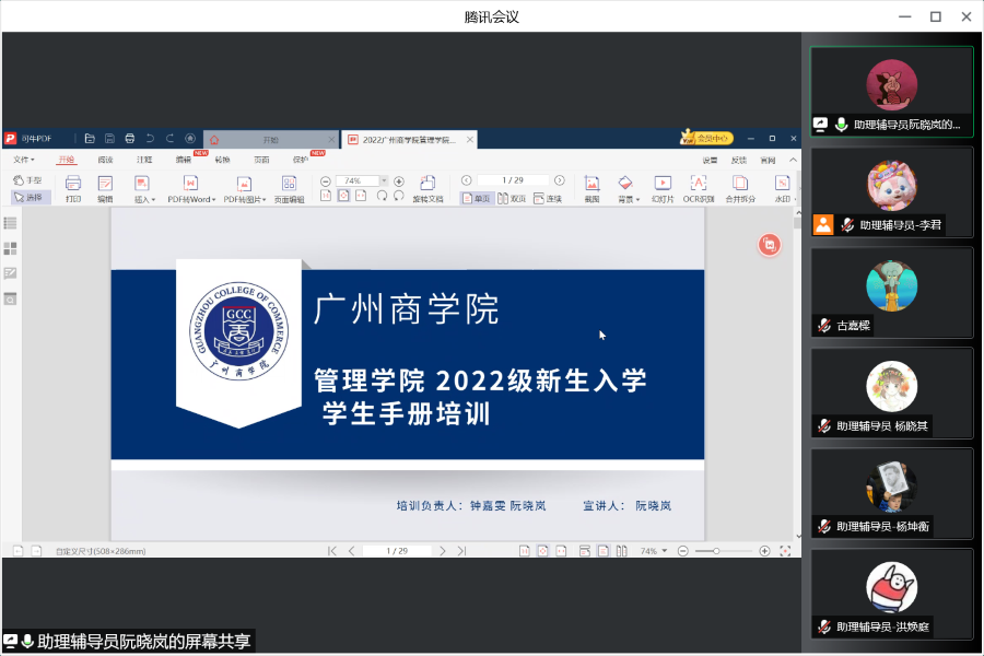 为进一步做好迎接2022级新生入学工作,强化我院助理辅导员的队伍建设,并打造一支辅助老师、服务学生的优秀助理辅导员团队。管理学院于7月19日下午15:00通过腾讯会议召开了第一场2022级助理辅导员培训会。管理学院党总支书记陈玉耿,2022级新生辅导员李文娣,2020级专升本辅导员周楚璇、林冬梅以及全体助理辅导员参加此次会议。