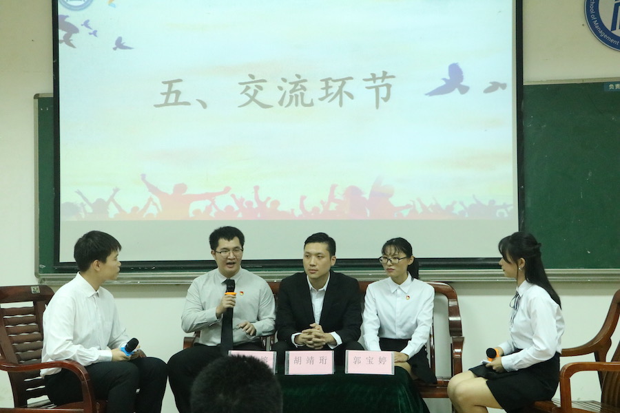 本次活动在管理学院文艺队伍声乐组带来的歌曲《最初的梦想》中拉开帷幕。接着通过一段新生入学生活及访问视频,带领大家回顾20级新生们初入大学的点点滴滴以及他们对未来学习生活的想法。随后,郭宝婷师姐分享了她的入党历程以及她在学习、竞赛、工作中所取得的成就。胡靖珩师兄分享了他的竞赛经历以及所获得的荣誉,从动力管理、时间管理、目标管理、学习方法四个方面介绍了有关学习的小技巧。李金熔师兄分享了他作为一名学生干部是如何建设优秀的班集体以及所取得的成就。在访谈环节中,主持人与在场的同学从入党、学习竞赛、学生干部三个方面向师兄师姐提出了不同的问题,师兄师姐们认真负责地为同学们解答,给同学们提供了宝贵的经验与建议。