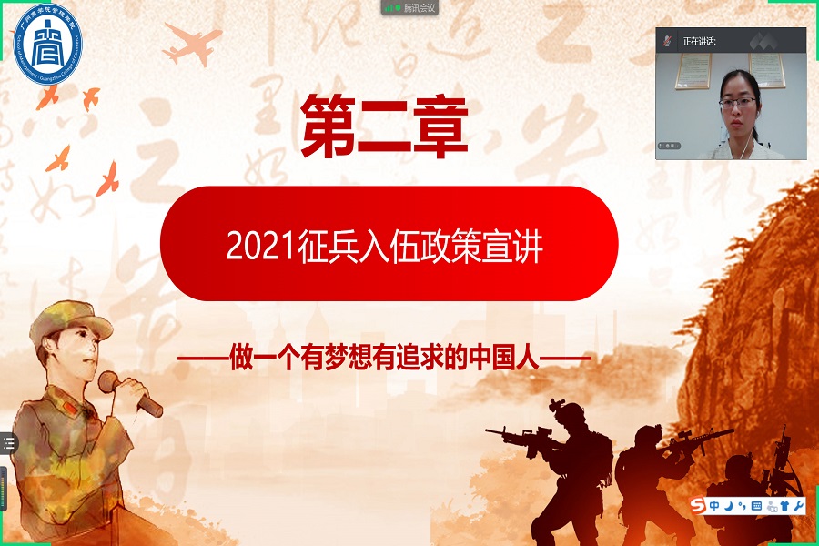 会议伊始,通过征兵宣讲视频引入本次会议的主题。随后,李文娣进行征兵入伍的政策宣讲。她分别对征兵入伍条件要求、大学生士兵在部队的发展空间、大学生士兵退役优秀政策、入伍具体流程等相关事宜进行了详细说明,使学生深入的了解入伍的政策,激励有意愿参军入伍的学生积极携笔从戎,保家卫国。接着,19级旅游管理二班连勇同学作为优秀退伍士兵的代表,分享了他从征兵入伍至退伍后的历程与感想。他从执勤、训练和生活等方面,讲述了他在军营生活中的苦与甜。在现场的答疑环节中,李文娣耐心解答同学提出的疑惑。