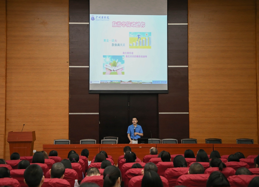 随后,舒光美为新生讲授了“大学——旅游与人生”的专业认知教育课程,他提出了六个“一”工程的期望,并向新生介绍了我院的师资力量以及近几年我院在教学、科研、学科学位建设、国际交流与合作等方面取得的成绩和成果。他介绍了学生学习,升学,就业等方面的工作,并希望同学们做到合理规划课余时间,加强体质锻炼。副院长向新生们介绍了我院开设的基础课程和特色课程,并且鼓励同学们努力学习专业课知识,为自己的未来就业打下良好的基础。引导广大学子树立正确的世界观、人生观和价值观,努力学习旅游知识前沿和意识前沿,以适应应用型人才市场的需求,做一个具有广商特点的高素质人才。