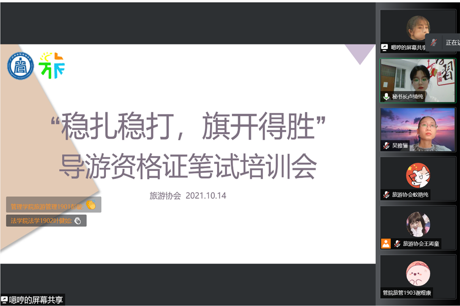 为提高同学们导游资格证的笔试水平,进一步增加灵活运用答题技巧的能力,增强同学们的考试信心。广州商学院旅游协会于10月14日晚19:30在腾讯会议顺利举行以“稳扎稳打,旗开得胜”为主题的导游资格证笔试培训会。出席本次活动的嘉宾分别是旅游管理教研室主任吴雅骊、旅游协会指导老师刘纽、管理学院2018级学生罗子龙、沈文茂,由旅游协会秘书长卢绮纯担任主持。