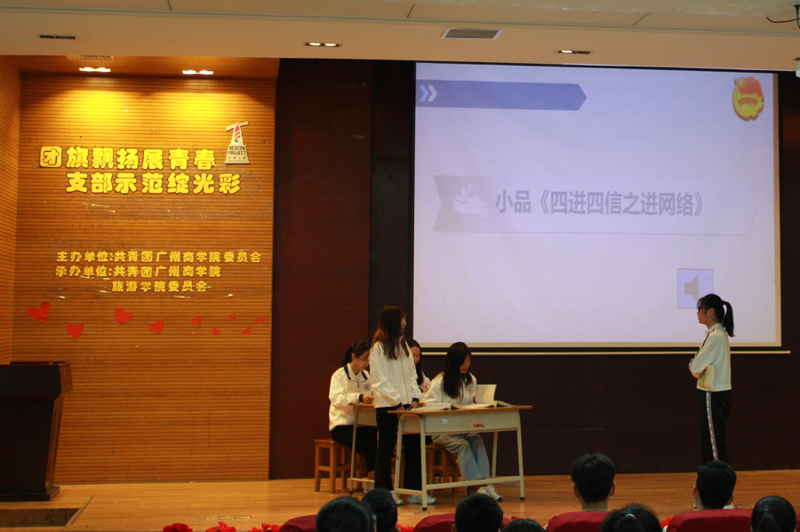 活动以一首《明天,你好》拉开帷幕,带动了全场的气氛,对明天充满希望。接下来是全体奏唱团歌;紧接着是由17级酒店管理二团支部作示范性团组织生活展示,讲述“四进四信”的主要内容,让同学们加深了对“四进四信”的了解,坚定理想信念;朗诵《我的祖国》,17级酒店管理二团支部的同学用饱含深情的声音和抑扬顿挫的语调歌颂祖国的伟大;结合学院专业知识,同学们充当了一次红色景区的导游,为我们讲解了“抱犊寨”等红色旅游景区的前世今生,增强了团员青年对红色旅游景区革命故事的了解;小品《四进四信之进网络》,风趣诙谐的表演让同学们加深印象,提醒着同学们更加合理地使用网络,走进网络,关注时事,将“四进四信”精神贯彻落实在生活中;优秀团员分享了他们在团组织的自身体验和感受,鼓励同学们积极参与团组织活动,从中去提高自身的综合能力,遇见更多美好的人和事。之后是颁奖环节,16级旅游管理一班团支部、17级旅游管理一团支部荣获三等奖,18级旅游管理二团支部、18级酒店管理一团支部荣获二等奖,17级酒店管理二团支部、18级旅游管理一团支部荣获一等奖。