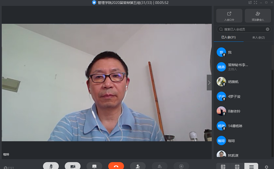 答辩是整个毕业论文工作的最后一个环节,可以进一步考查和验证学生对论题的认识程度和当场论证论题的能力,进一步考查学生对专业知识掌握的深度和广度,审查毕业论文是否学生自己独立完成等情况。根据目前疫情现状,为提高毕业论文质量,保证论文答辩工作的顺利进行,管理学院于2020年5月16日采用线上答辩,2020届毕业生共609人,分24组同时进行,答辩过程顺利,答辩结果师生满意。