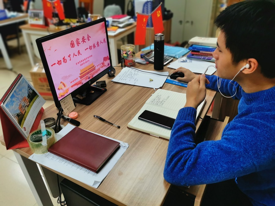 2、国家安全教育深入班会。各年级根据学生特色采取了主题班会与学生线下自学的方式。同学们在班会展开前采取线下自学的方式充实自己的理论知识,并在班会上分享学习心得与感受。辅导员们通过线上主题班会组织同学们观看国家安全宣传片,介绍了解国家安全体系并且结合以习近平同志为核心的党中央关于疫情防控工作的决策部署,引导同学们将总体国家安全观贯穿到抗疫全过程之中,牢固树立国家安全意识,逐步提高应对疫情灾情的素质,提升维护国家安全的自觉性和主动性。