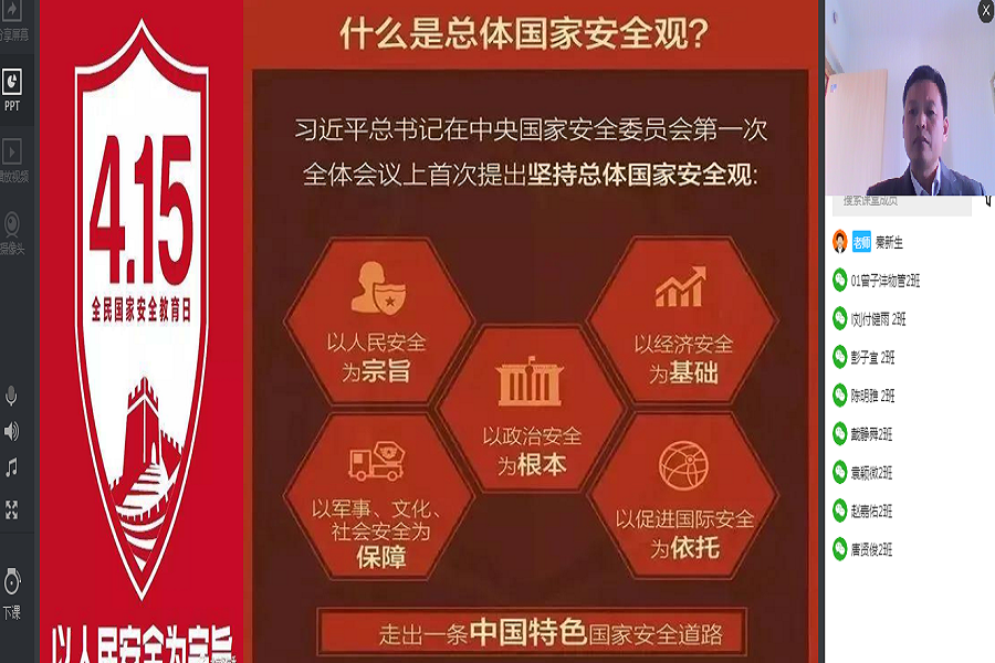 1、国家安全教育深入课堂。为充分使老师与同学们认识到国家安全的重要性以及营造“国家安全,人人有责”的氛围,把国家安全教育融入教育教学活动的各层面,贯穿人才培养全过程。4月15日当天任课教师将国家安全带入网络课堂,在课上结合专业知识为同学们讲解国家安全知识,大力宣传政治安全、国土安全、军事安全等11个领域的国家安全眼球要求和法规。