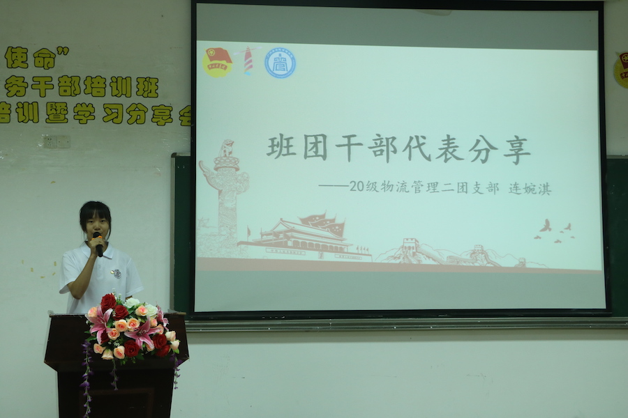 在分享环节中,优秀班级代表物流管理1801班长罗鑫平首先从班团干部的角色定位、掌握班团情况、班团目标的制定、特色班团建设等方面分享了他们加强班团凝聚力的方法与经验。接着优秀班级代表旅游管理1902班长吴沁遥从班级简介、班级情况、班风展示、班团干部的自我修养四个方面进行分享。她重点介绍了作为班团干部的原则和工作方法以及班团常见的问题及应对措施。班委代表电子商务1803刘美欣分享了她连续三年担任班委的工作心得,强调了沟通的重要性,并提出要充分发挥班委的作用,为建设优秀班集体添砖加瓦。班委代表电子商务1903潘慧颖和物流管理2002连婉淇分享了她们的基层团务工作培训心得和过去的班委工作经验,同时也对成为一名优秀班团干部提出了相关建议。五位分享者以班级为重,架起了学校、老师与同学之间沟通的桥梁,为班级建设做出了巨大贡献,提高了班级凝聚力和战斗力,彰显了新时代青年人敢于负责、勇担使命的精神面貌。