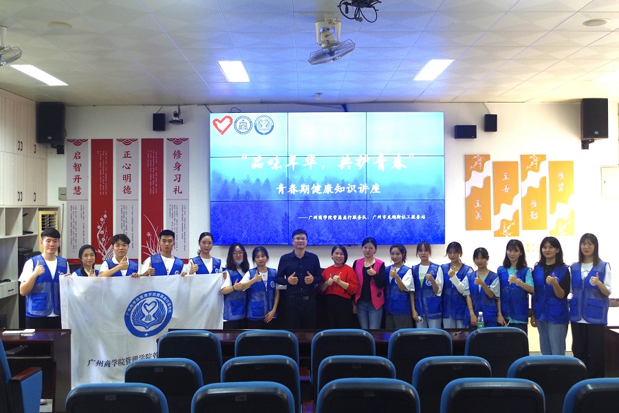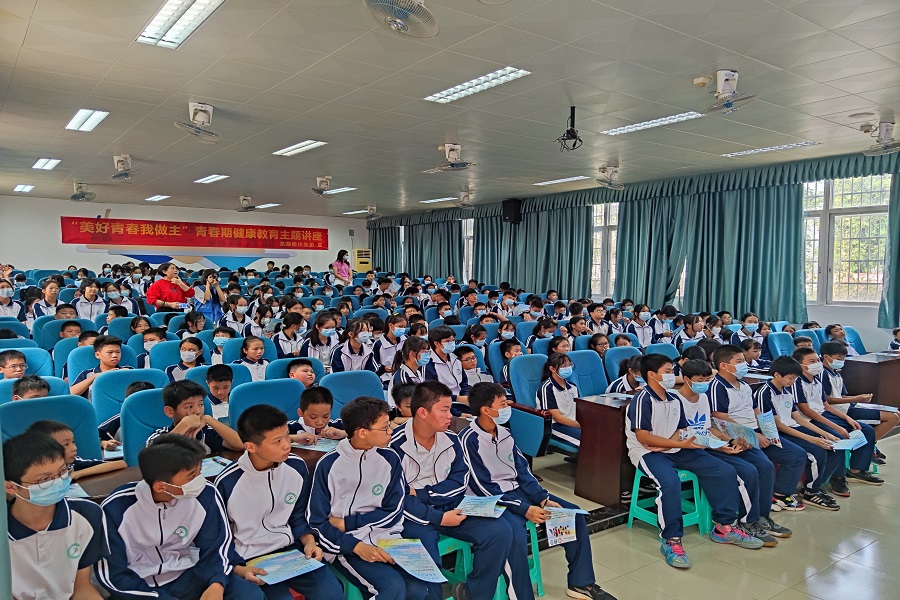 青春期是人生的关键时期,接受正确、及时的青春期教育对青少年极为重要。为扎实推进“我为群众办实事”,提高青少年的心理素质,增强青少年健康意识和自我保护能力,10月14日下午,我院管愿益行服务队联合广州市龙湖街社工服务站前往广州市黄埔区九佛中学开展“品味年华,共护青春”青春期健康知识讲座。出席本次活动的有九佛中学团委书记何连女、学生工作处副主任杨镜林、七年级主任张永辉,龙湖街社工站社工刘伟嫦、何紫琳,管愿益行服务队代表及269名九佛中学七年级学生。