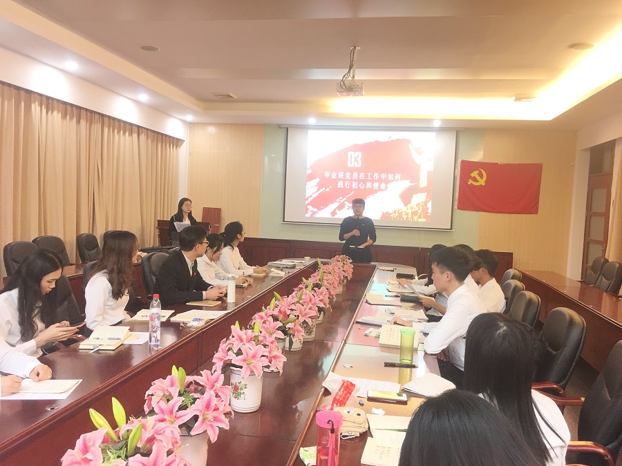 党支部书记徐佳佳主要围绕三个问题开讲,分别是“我是谁”、“什么是初心使命”、“毕业班党员如何践行初心使命”。通过“我是谁”这个问题导入,让大家有了学生党员的身份认同感。徐佳佳书记指出,作为学生党员要明确中国共产党的初心使命,中国共产党人的初心使命就是为中国人民谋幸福,为中华民族谋复兴。作为毕业班党员,出了社会后将面临许许多多的诱惑,在如何践行中国共产党的初心使命上会有所懈怠,徐佳佳书记对此提出了四点建议:一是要永远充满激情,奋斗不止,要把责任作为动力,满腔热忱地投入到工作中。二是要做到从不抱怨,心态平和,以身作则,调整好自身的心态。三是要做到永不言弃,艰苦奋斗。四是要正确对待和适应复杂环境,成为有担当、有本领、有理想的时代新人。