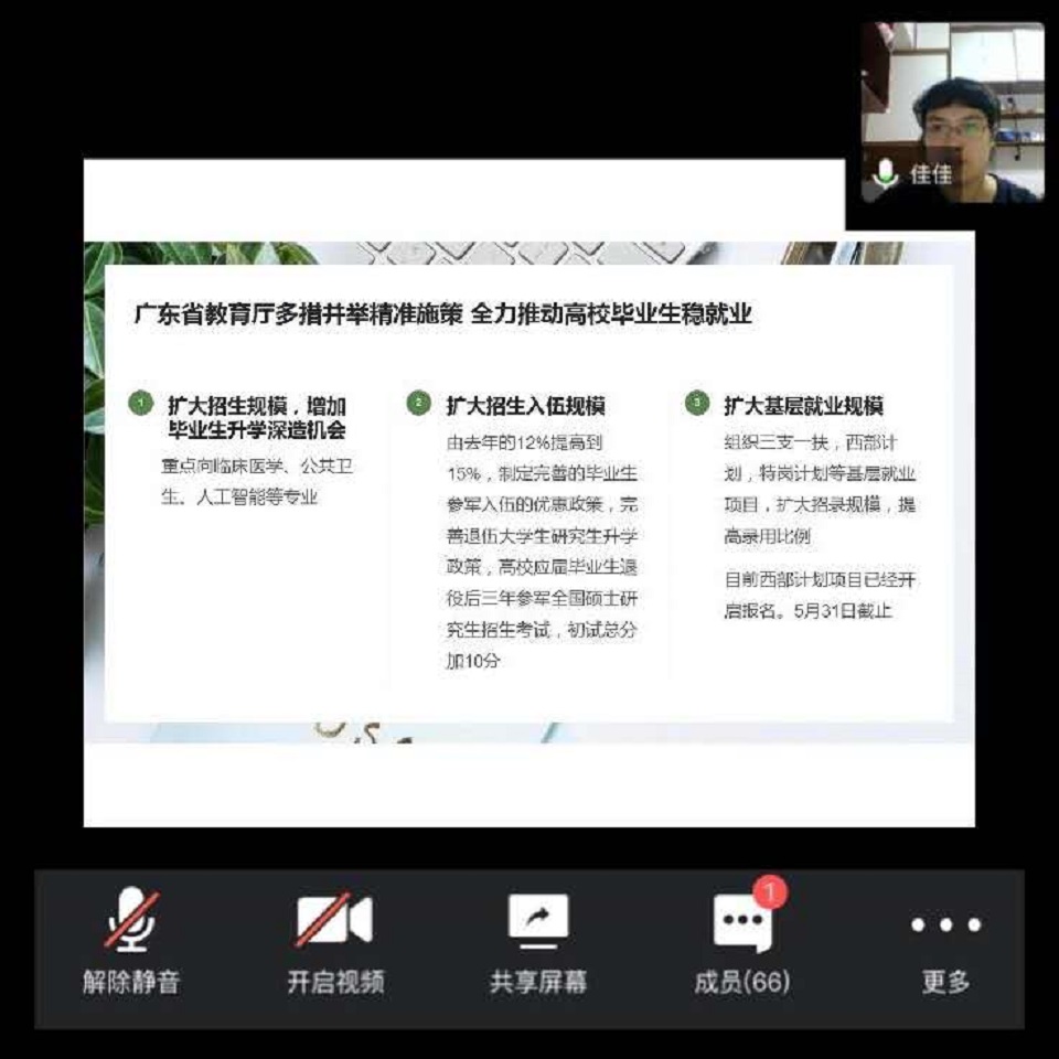 徐佳佳就目前就业形势与年级就业进展情况进行分析,就毕业生当前存在的暂不就业原因、就业目标模糊等问题提出解决思路,引导毕业生要认清形势,了解岗位需求,明确自身定位,坚定就业信心。鼓励他们要树立远大的理想,动员毕业生到基层就业,踊跃应征入伍。围绕毕业生就业工作具体事项如毕业去向上报、就业协议申请和就业信息上报等方面进行了详细讲解,结合国家在新冠肺炎疫情影响下出台的就业政策来鼓励毕业生全面审视自身优势,提升就业应对能力,拓宽就业渠道。